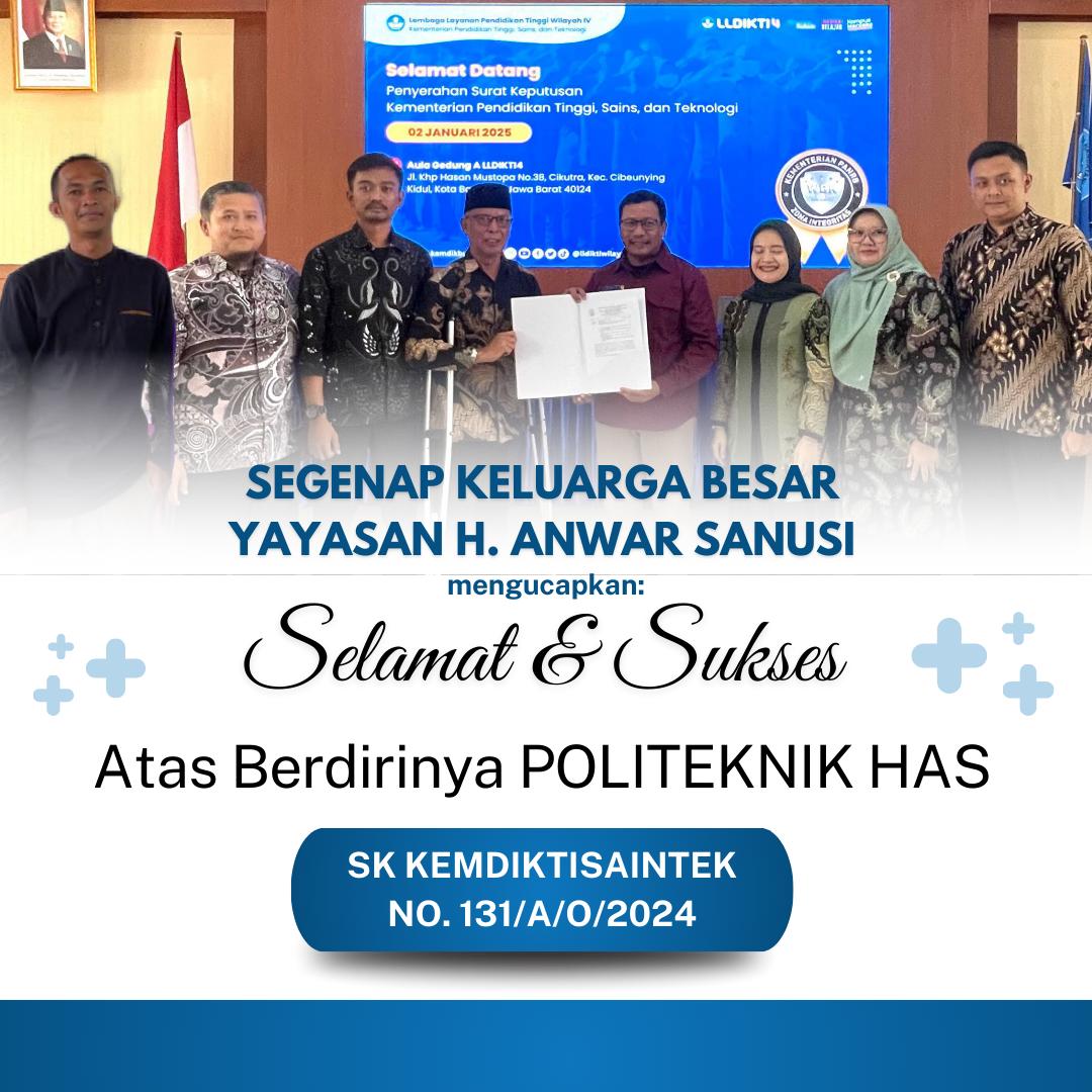 Dengan penuh rasa syukur, kami mengucapkan terima kasih yang sebesar-besarnya kepada seluruh pihak yang telah memberikan dukungan, doa, dan kerja keras dalam proses pendirian Politeknik HAS. Berkat rahmat Tuhan Yang Maha Esa dan dukungan dari pemerintah, mitra kerja, serta masyarakat, kami telah resmi mendapatkan izin operasional sebagai lembaga pendidikan tinggi. Ini adalah langkah awal menuju kontribusi nyata dalam mencetak generasi unggul dan profesional di bidangnya. Semoga kehadiran Politeknik HAS menjadi cahaya dan harapan baru bagi kemajuan bangsa dan daerah